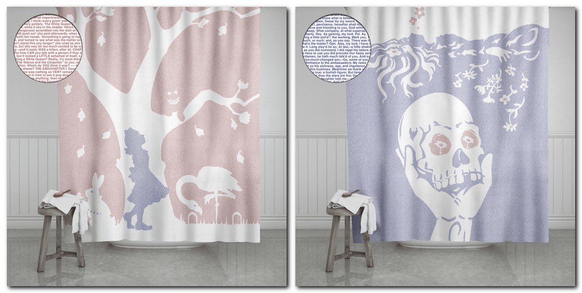 Fotografia ediției: O serie de perdele de duș create de Litographs, fiecare dintre ele fiind alcătuite din circa 50.000 de cuvinte din cartea preferată. În imagine, “Alice în Țara Minunilor” și ”Hamlet”. Sursa: Litographs.