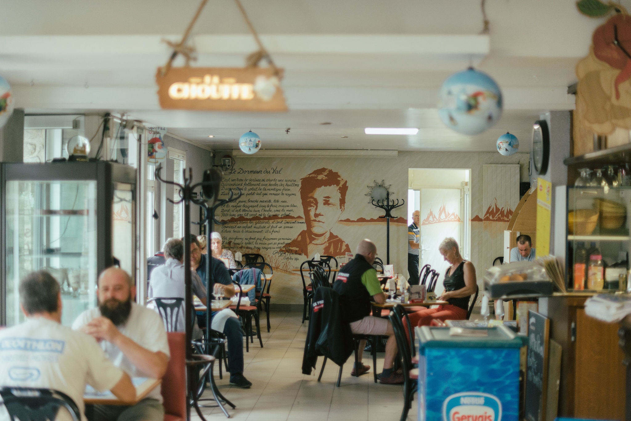 Fotografia ediției: Un portret și un poem ale lui Arthur Rimbaud într-o cafenea din Charleville-Mézières. Sursa: The New York Times.