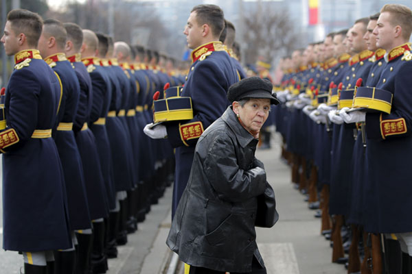 Fotografia dimineții – O femeie trece prin dreptul gărzii care aduce onorurul eroilor uciși în decembrie 1989. Vadim Ghirda / AP: