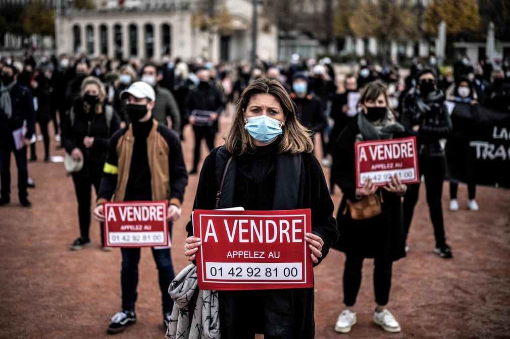 Fotografia serii – Protestatari în Lyon, Franța, purtând afișez cu „De vânzare”, ei cerând guvernului redeschiderea magazinilor, închise din cauza pandemiei.