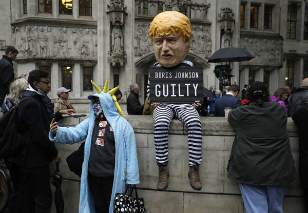 Fotografia dimineții – O persoană il caricaturizează pe premierul Boris Johnson în fața Curții Supreme. AP Photo/Matt Dunham: