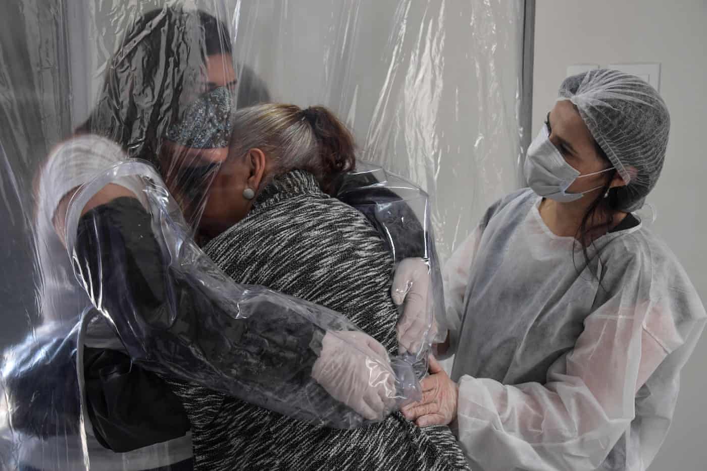Fotografia dimineții – Suzane Valverde își îmbrățișează mama de 85 de ani, printr-o plasă de protecție din plastic, la un centru de îngrijire al bătrânilor din São Paulo, Brazilia. Nelson Almeida/AFP/Getty Images: