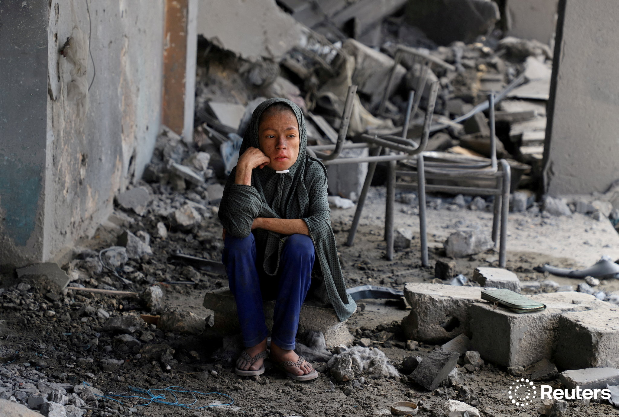 Fotografia dimineții – O fată palestiniană stă printre dărâmăturile unei școli a Națiunilor Unite, din Gaza, unde se adăposteau persoane strămutate, după ce aceasta a fost lovită de atacuri israeliene. Ebrahim Hajjaj: