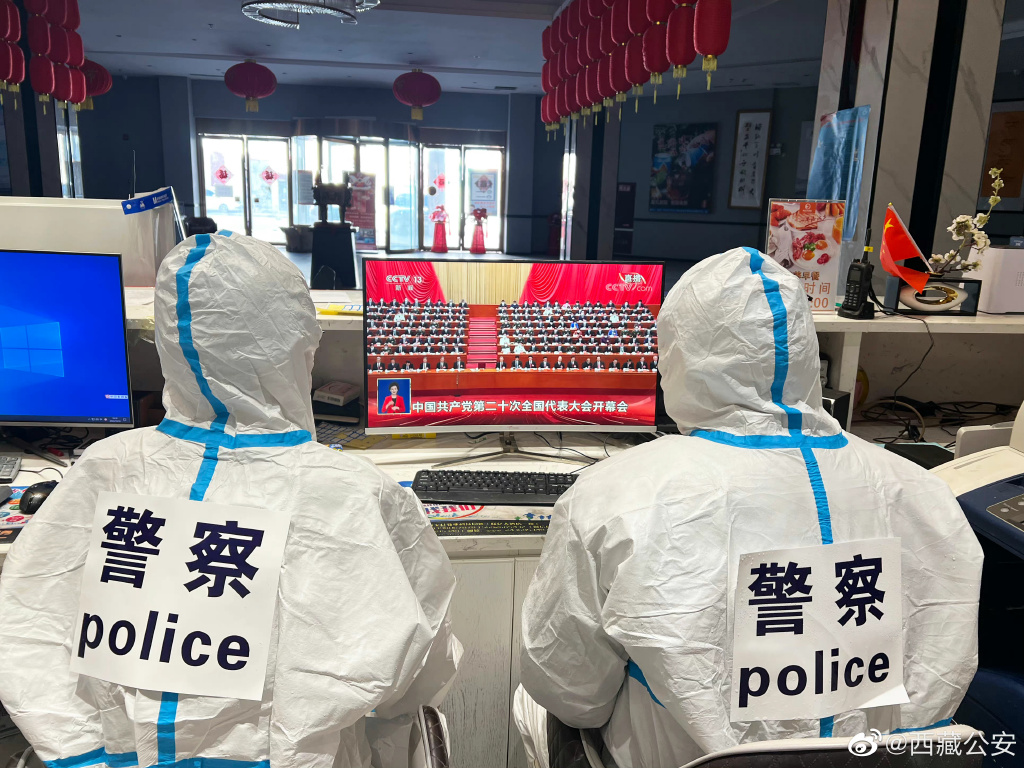 Fotografia dimineții este din China, unde doi polițiști se uită la transmisia de la congresul partidului Comunist:
