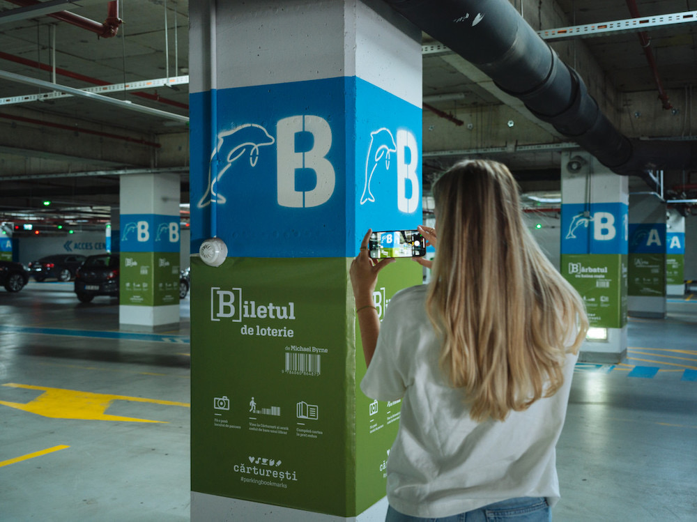 Fotografia ediției: Lanțul de librării Cărturești a găsit o soluție pentru a capta atenția clienților mall-urilor și de a-i transforma în viitori cititori – #ParkingBookmarks, o operațiune unică de librărie care promovează lectura în rândul șoferilor, prin amplasarea pe stâlpii care indică poziția mașinilor a unor afișe care promovează o carte, inclusiv cu un voucher de reducere. Sursa: ActuaLitte.