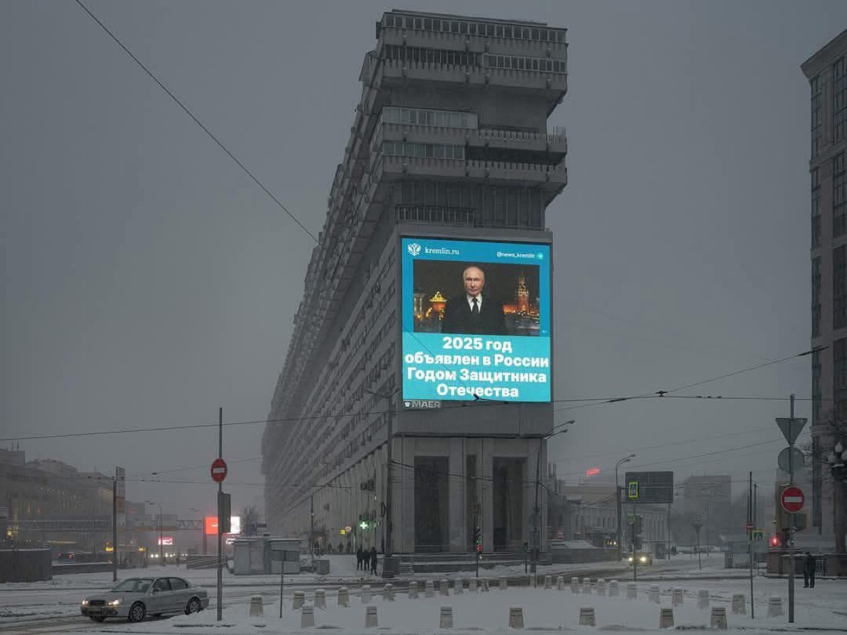 Fotografia dimineții – Un panou electronic din Moscova îl prezintă pe președintele Putin declarând că 2025 este “anul apărătorului patriei”. Alexander Gronski: