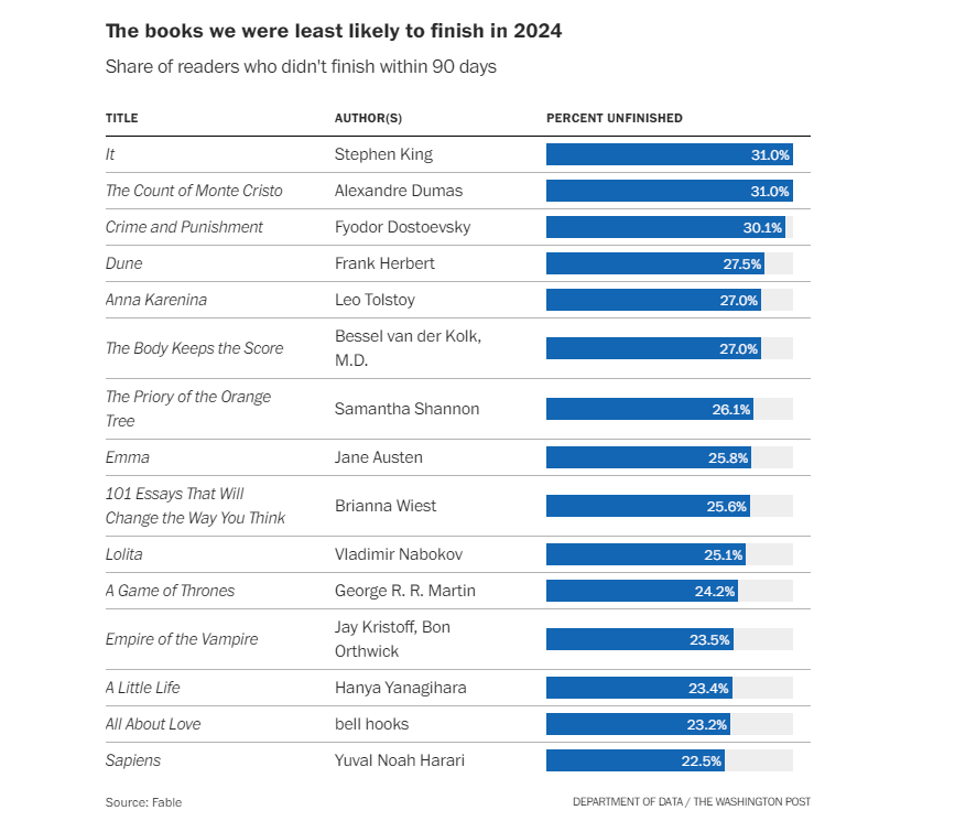 Fotografia săptămânii: Cărțile pe care cititorii americani nu le-au terminat în maximum 90 de zile, din cele citite în 2024. Sursa: The Washington Post.