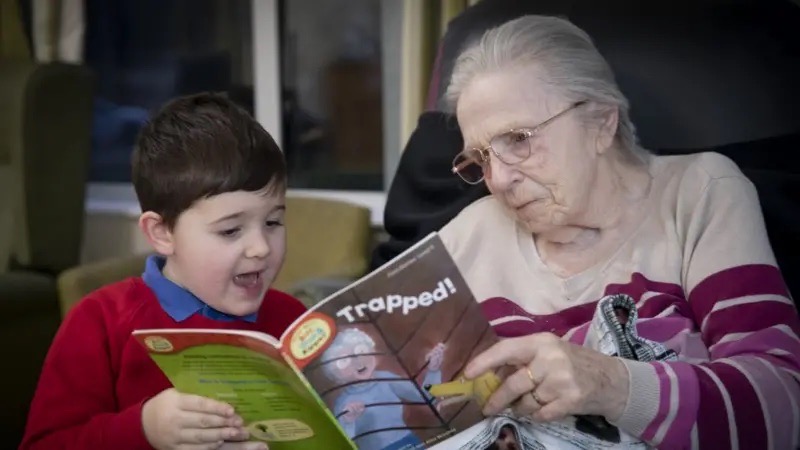 Fotografia săptămânii: Harri, în vârstă de cinci ani, citește volumul „Trapped!” unui rezident dintr-un centru de îngrijire din Wrexham, Anglia. Sursă: Răsfoiala.
