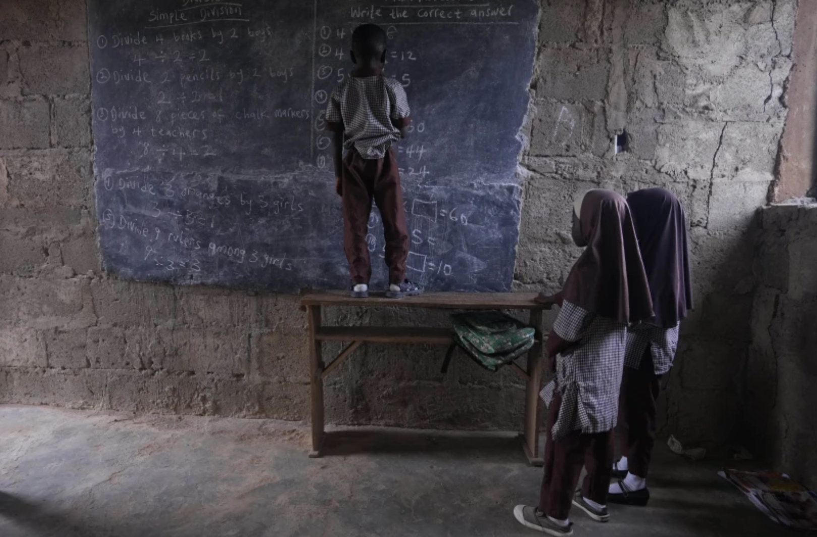 Fotografia săptămânii: Multe clădiri din Nigeria nu au acces la rețeaua națională de electricitate, ceea ce reprezintă o realitate pentru mulți elevi din această țară. În imagine, un elev de la Excelent Moral School încearcă să răspundă la o întrebare de matematică pe o tablă aflată într-o sală de clasă slab luminată din Ibadan, Nigeria, marți, 28 mai 2024. Sursă fotografie: Associated Press.