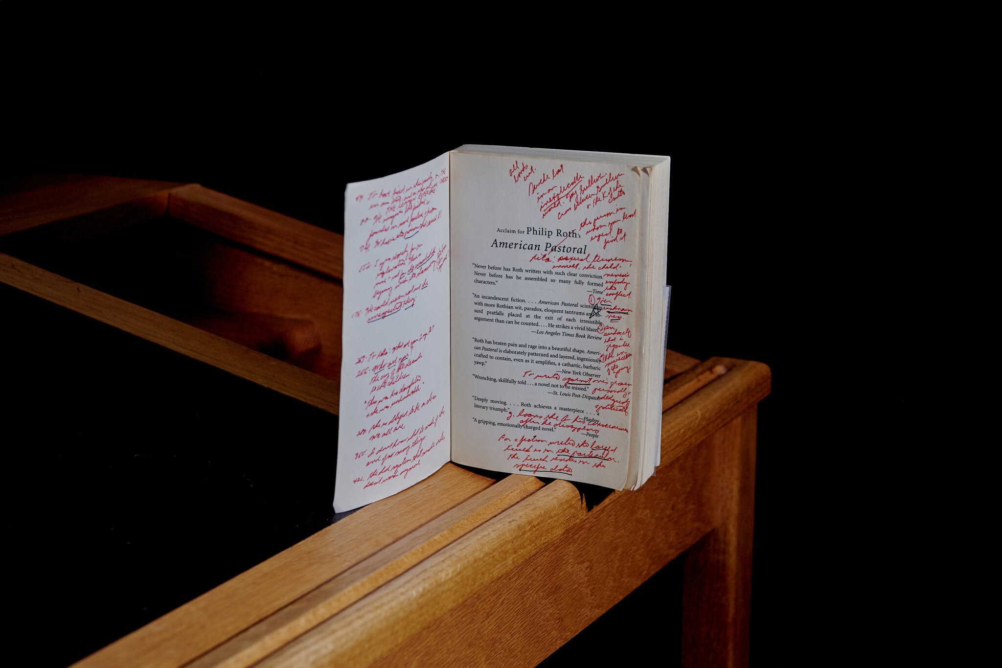 Fotografia ediției: Vizitatorii Newark Public Library pot vedea în curând colecția Philip Roth, cuprinzând aproximativ 3.700 de cărți lăsate de autor bibliotecii din orașul natal. În imagine, un exemplar din „Pastorala americană”, cu însemnările scriitorului. Sursa: New York Times.