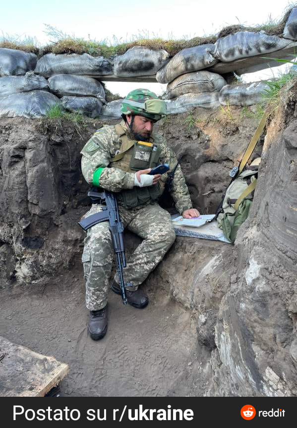 Fotografia ediției: Fedir Shandor, profesor de turism și industrii ale ospitalității la universitatea din Ujhorod, Ucraina, predă cursurile studenților săi, de două luni, din tranșee. Sursa: Reddit.com.
