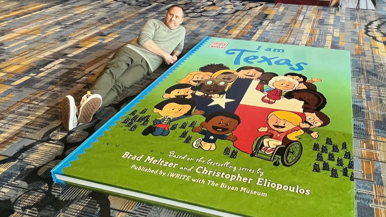 Fotografia ediției: Ilustratorul Christopher Eliopoulos prezintă volumul de peste doi metri, „I Am Texas”. Sursa: iWRITE.