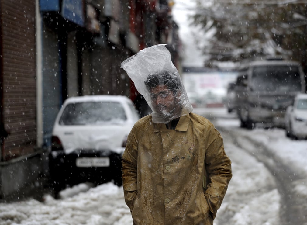 Fotografia serii – Un bărbat se protejează de zăpadă cu o pungă din plastic în Srinagar, Kashmir. Mukhtar Khan/AP: