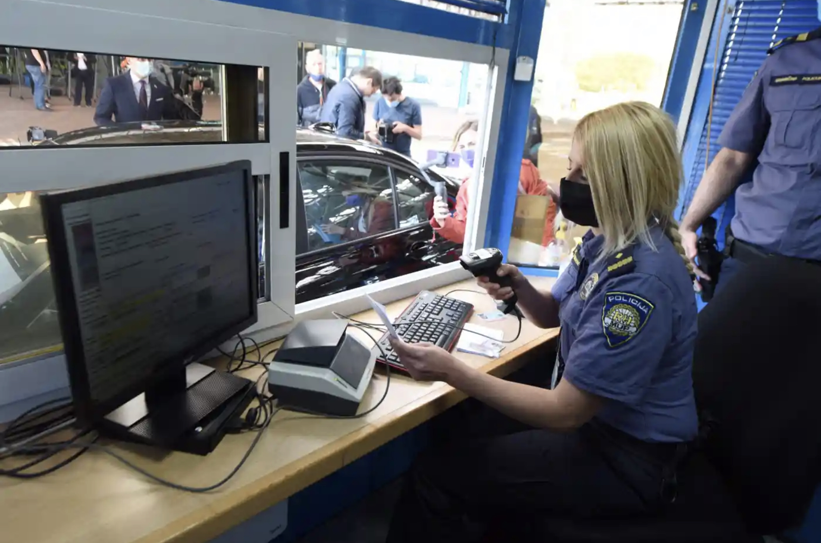 Fotografia dimineții – Un ofițer de poliție scanează un pașaport digital Covid la granița dintre Croația și Slivenia. Denis Lovrović/AFP/Getty Images: