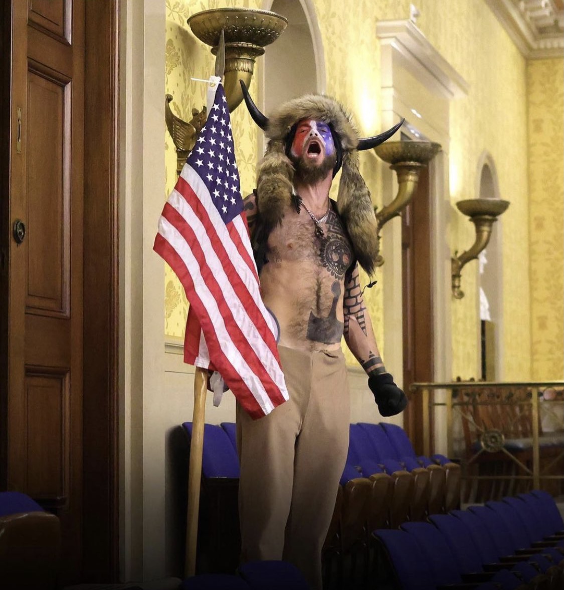 Fotografia serii – Jake Angeli, 32 de ani, originar din Arizona, a devenit o celebritate pe reţele de socializare în doar câteva ore, după evenimentele din Congresul american: