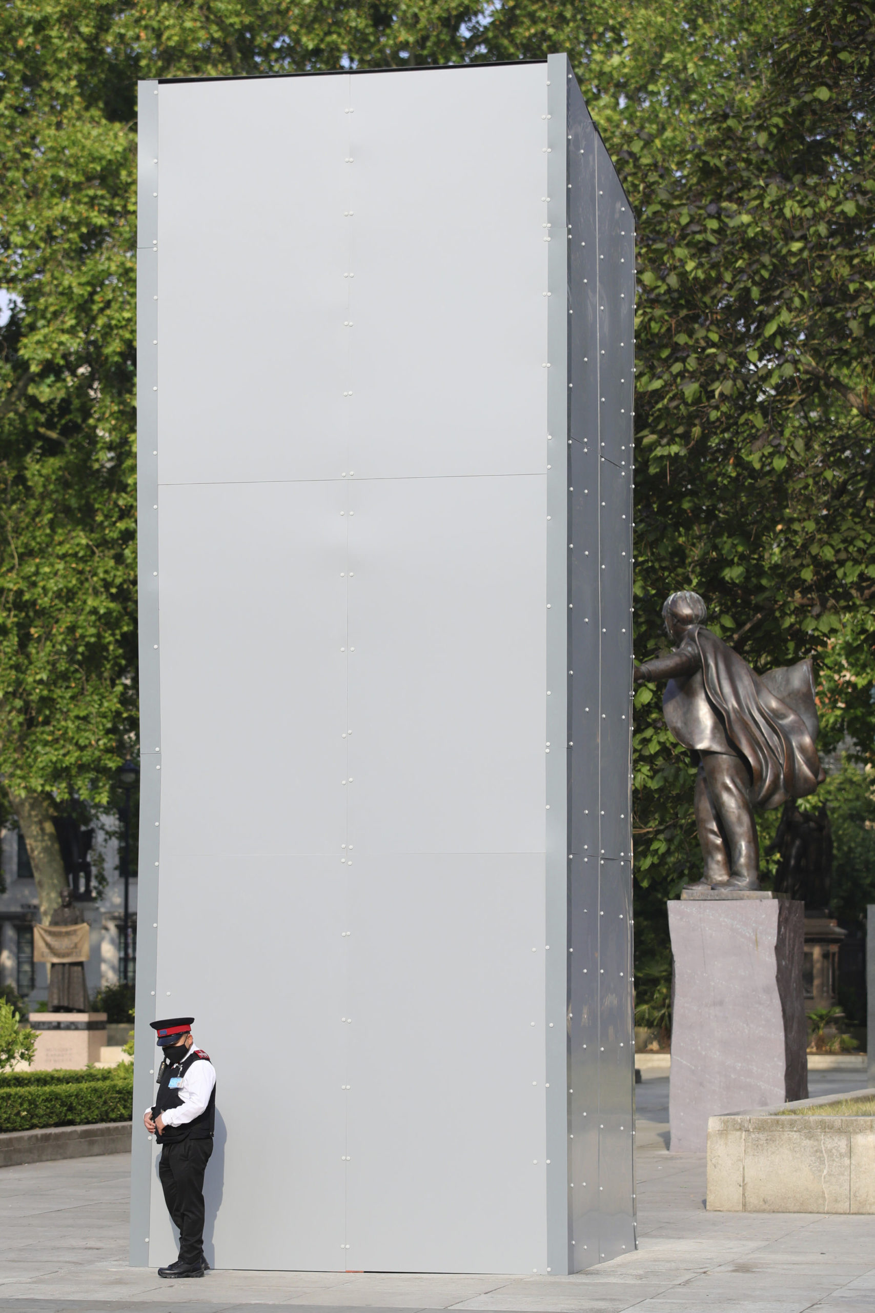 Fotografia dimineții – Statuia lui Winston Churchill din Londra acoperită pentru a fi protejată înaintea protestelor anunțate în acest weekend. AP: