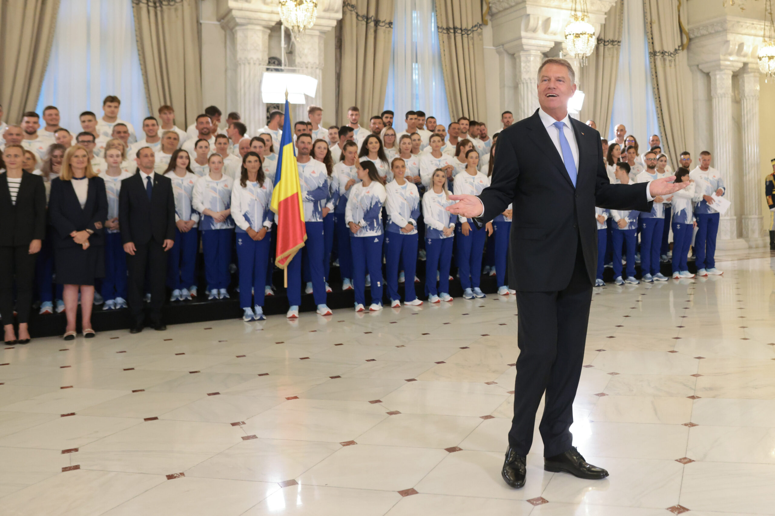 Fotografia dimineții – Președintele României, Klaus Iohannis, a predat drapelul olimpic Echipei Olimpice a României înaintea participării la Jocurile Olimpice de la Paris 2024. Inquam Photos / George Călin: