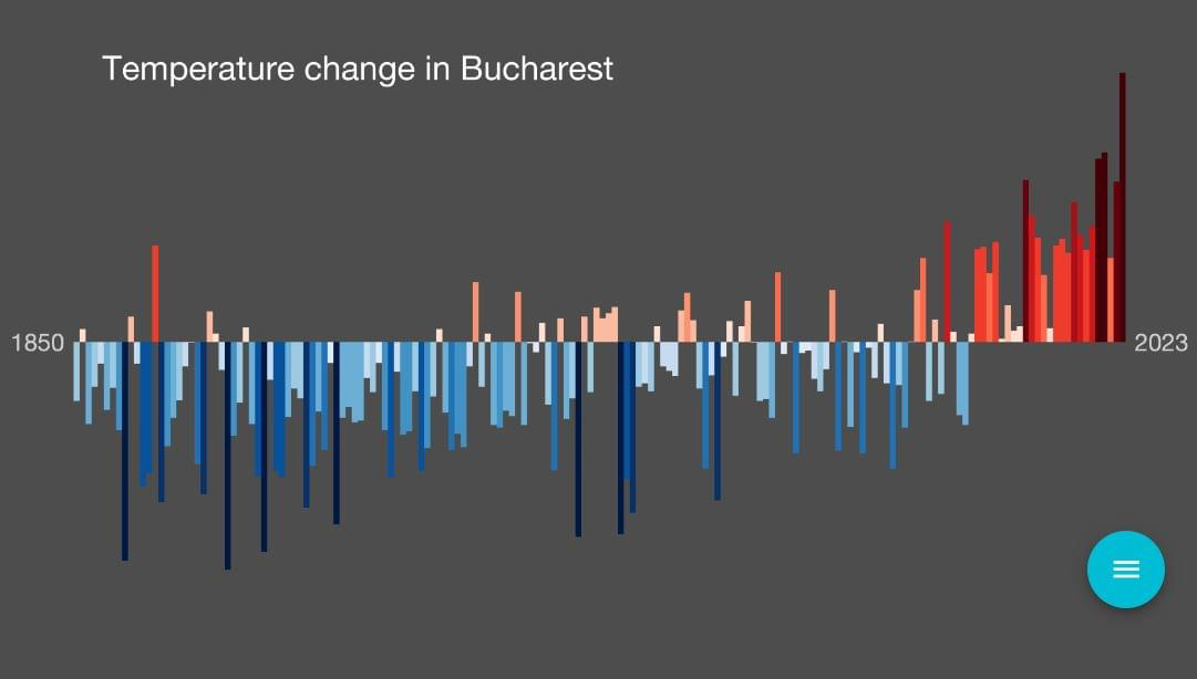 Poza ediției. Temperaturile medii in București 1850-2023. Anul 2024 are potențialul celui mai călduros an înregistrat vreodată. (Showyourstripes)