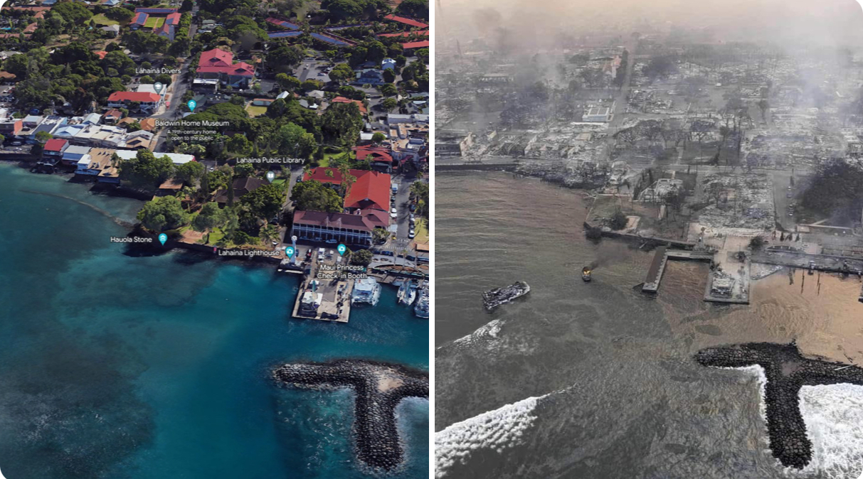 Fotografia dimineții – Înainte și după incendiul din Lahaina, Maui, Hawaii.