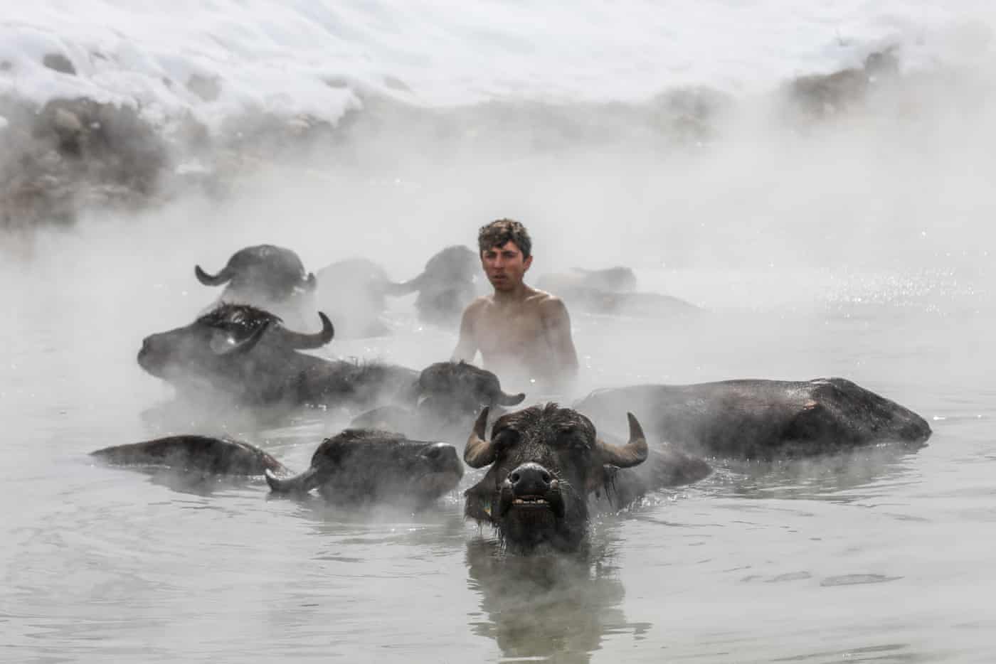 Fotografia dimineții – Un sătean și-a dus bivolii la spălat în apele termale din Bitlis, Turcia, unde temperatura apei este de 40 grade Celsius, Anadolu Agency/Getty Images: