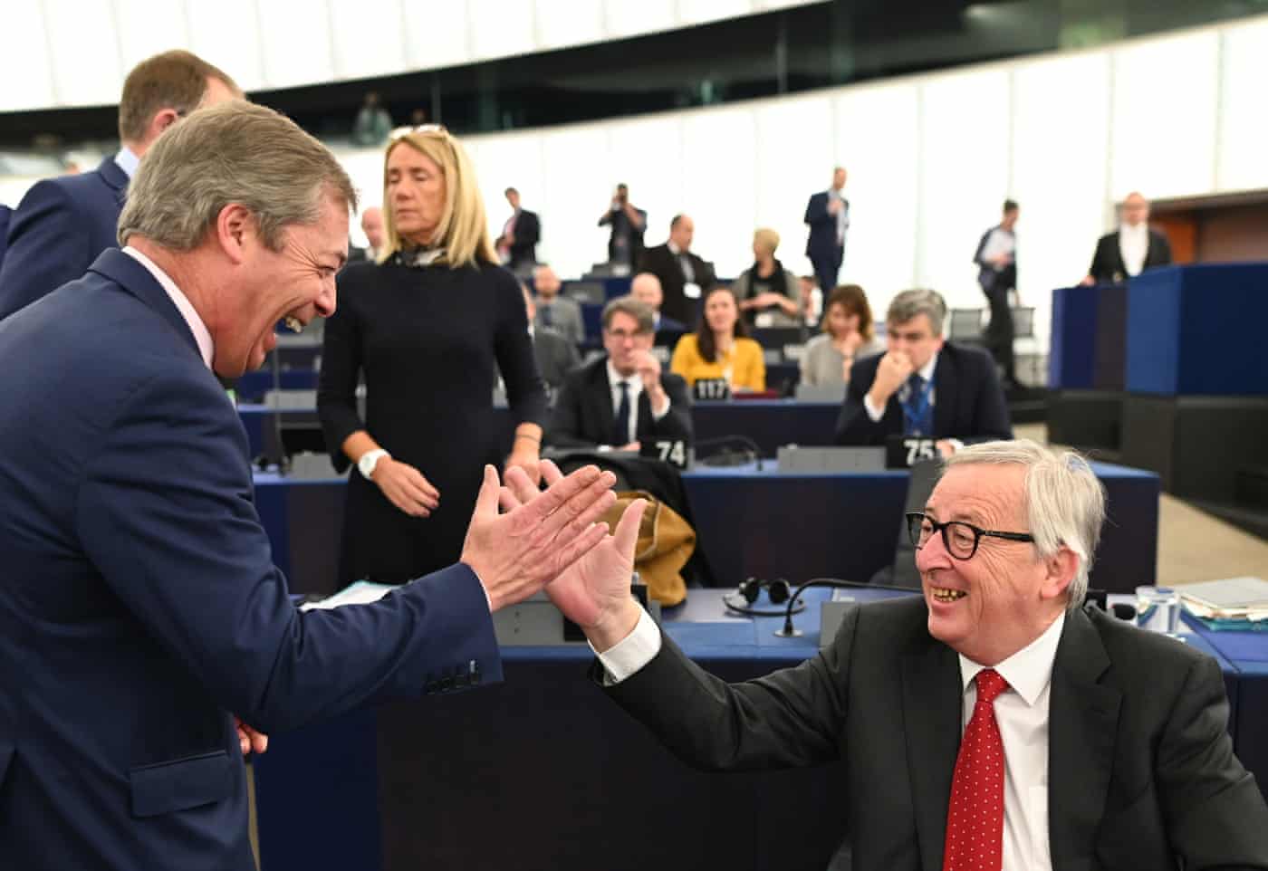 Fotografia dimineții – Nigel Farage glumește cu Jean-Claude Juncker, președintele Comisiei Europene, la Strasbourg, în parlamentul european. Patrick Seeger/EPA: