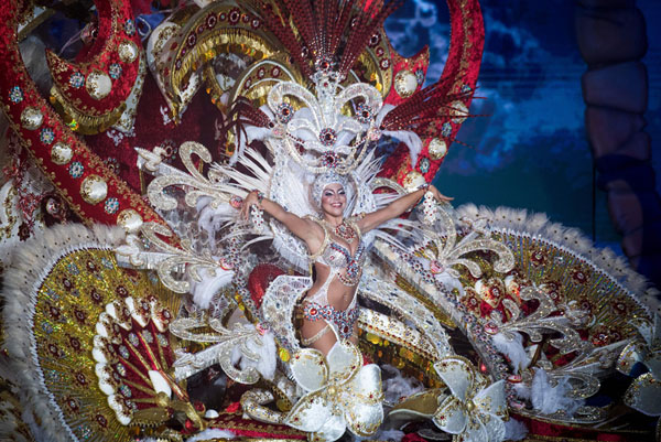 Fotografia serii – Una dintre cele 19 nominalizate la titlul de regina carnavalului Santa Cruz, din Tenerife, își prezintă costumul, Desiree Martin / AFP / Getty: