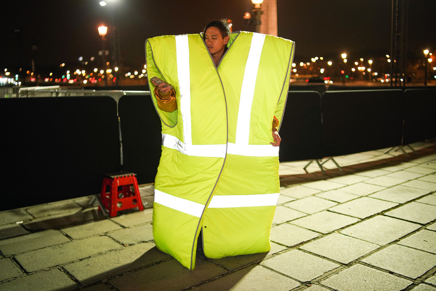 Fotografia serii – Un trecător poartă o vestă galbenă supradimensionată în fața locației unde avea loc o prezentare de modă, Paris, Edward Berthelot / Getty: