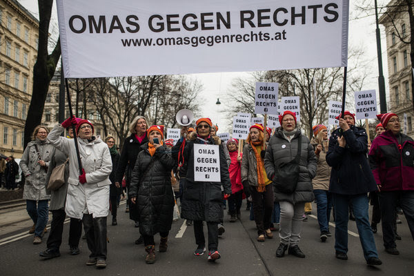 Fotografia serii – “Bunicile împotriva extremei drepte” scrie pe bannerul afișat la un miting al femeilor în vârstă care protestează împotriva transformării Austriei într-o țară dominată de extremă dreaptă: