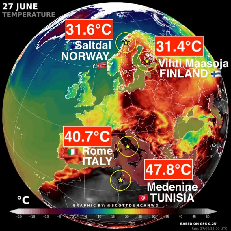 Norvegia a înregistrat miercuri, pe 29 iunie, o temperatură de 32,5 C la Banak, cea mai ridicată temperatură înregistrată vreodată în Cercul Arctic din Europa și semnificativ mai mare decât media din iunie de 13 grade Celsius. Căldura extremă s-a extins și în Africa de Nord, temperaturile din Tunisia egalând luni, pe 27 iunie, recordul lunar de 48,7 grade Celsius.