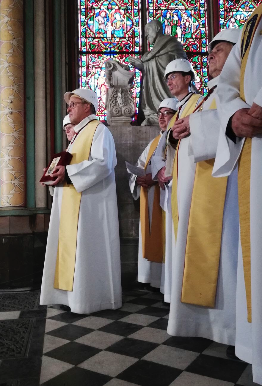 Fotografia dimineții – Preoții care au oficial ieri prima slujbă, după incendiul de acum două luni, la catedrala Notre-Dame, au purtat căști de protecție. Karine Perret, Pool via AP: