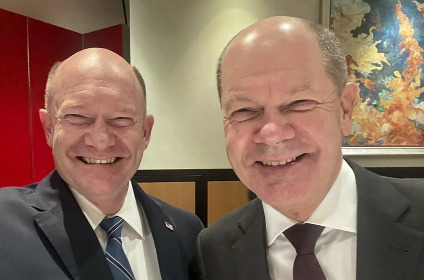 Fotografia dimineții – Cancelarul german Olaf Scholz, care s-a întâlnit cu senatorul democrat american Chris Coons, a publicat o fotografie în care se amuză pe seama asemănării lor, declarându-se ”încântat să-mi revăd sosia”.