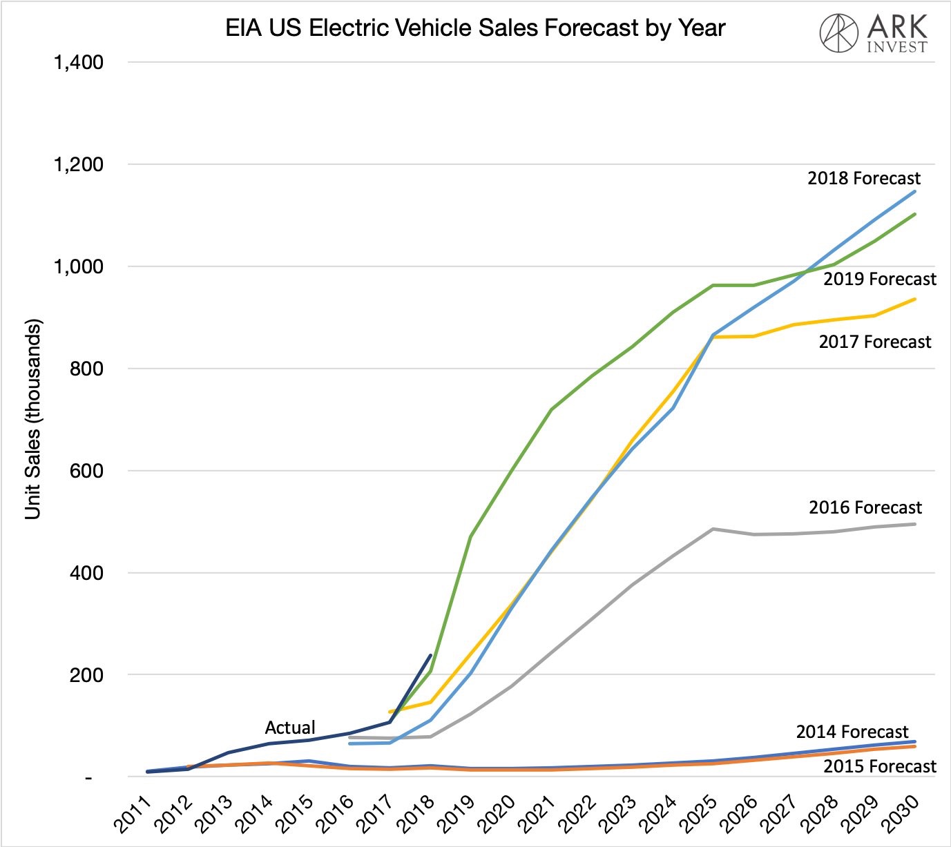 Fotografia dimineții – În loc de o fotografie vă propun un grafic despre predicții vs ce s-a întâmplat pe piața mașinilor electrice din SUA: