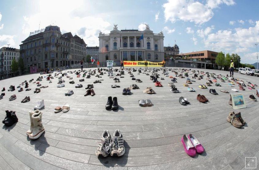 10. Piețele publice sunt populate cu perechi de încălțăminte aliniate când activiștii elvețieni se supun limitărilor de corona. Activiștii verzi au plasat rânduri de cizme și încălțăminte într-o piață din Zurich pentru a inlocui protestatarii care, în mod normal, vin în persoană pentru a cere acțiuni privind schimbările climatice. (Reuters) (Sursa Foto)