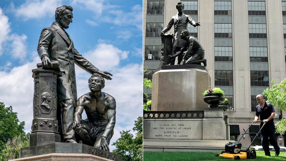 Fotografia serii – Protestatarii americani au cerut ca inclusiv statuile, din D.C. și Boston, ce-l reprezintă pe președintele Abraham Lincoln eliberând un sclav să fie date jos. J. Scott Applewhite/AP, Steven Senne/AP: