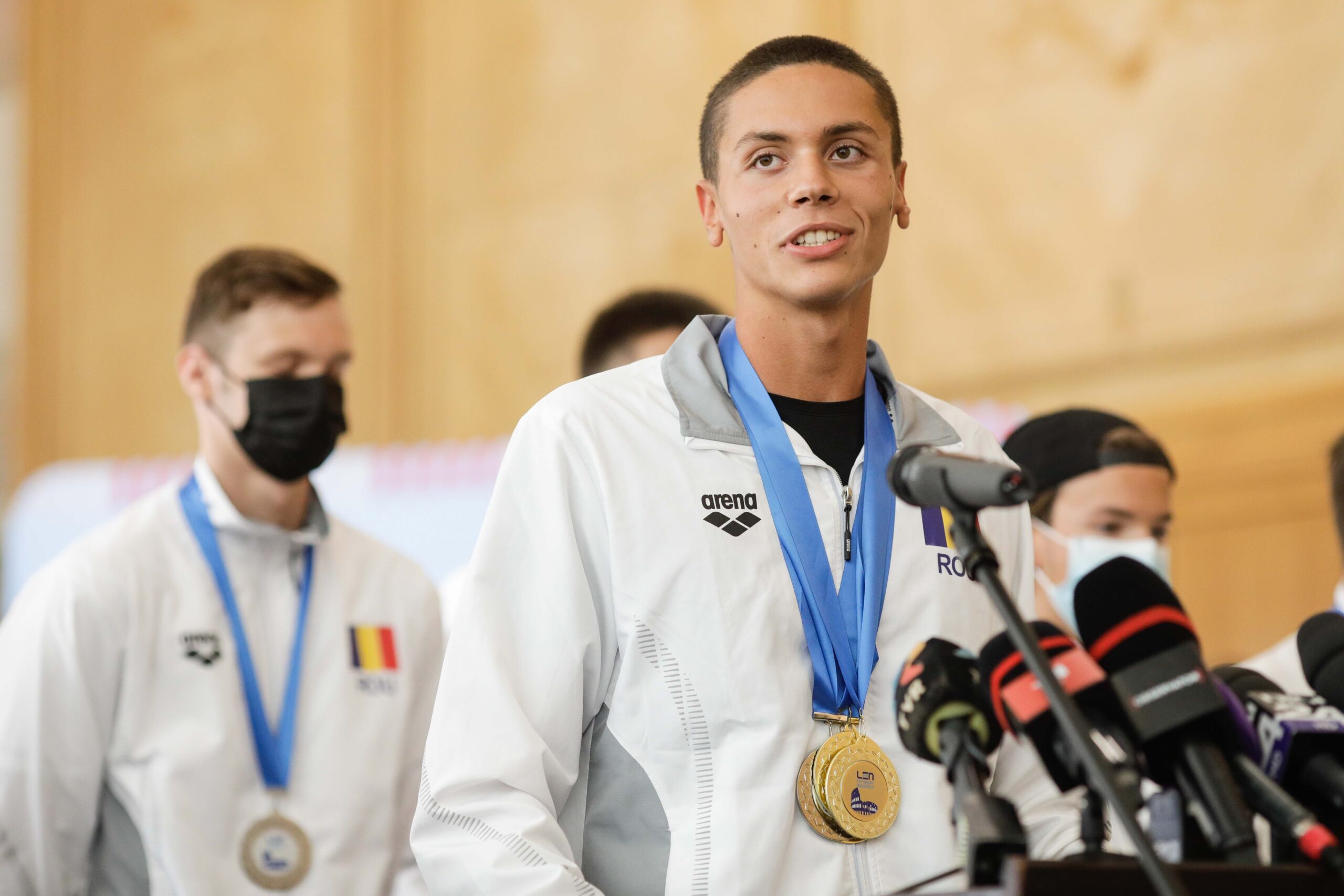 Fotografia dimineții – Inotătorul David Popovici, care are 16 ani, la sosirea pe Otopeni după ce a câștigat patru medalii de aur la Europenele de natație pentru juniori. George Călin, Inquam Photos: