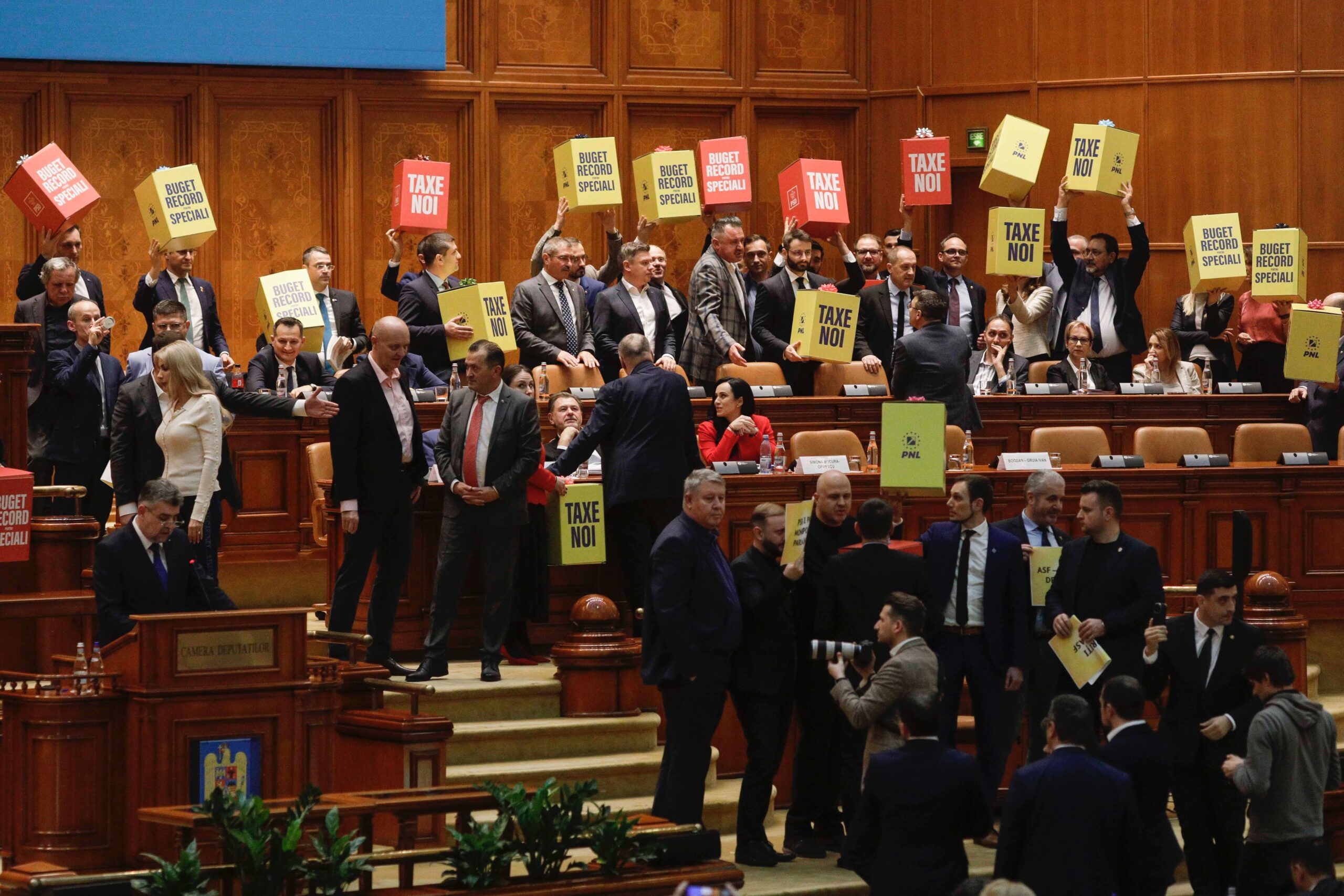 Fotografia dimineții – Parlamentarii AUR și USR au protestat în ședința plenului reunit al Camerei Deputaţilor si Senatului pentru dezbaterea bugetului Romaniei pe anul 2023. Inquam Photos / George Calin:
