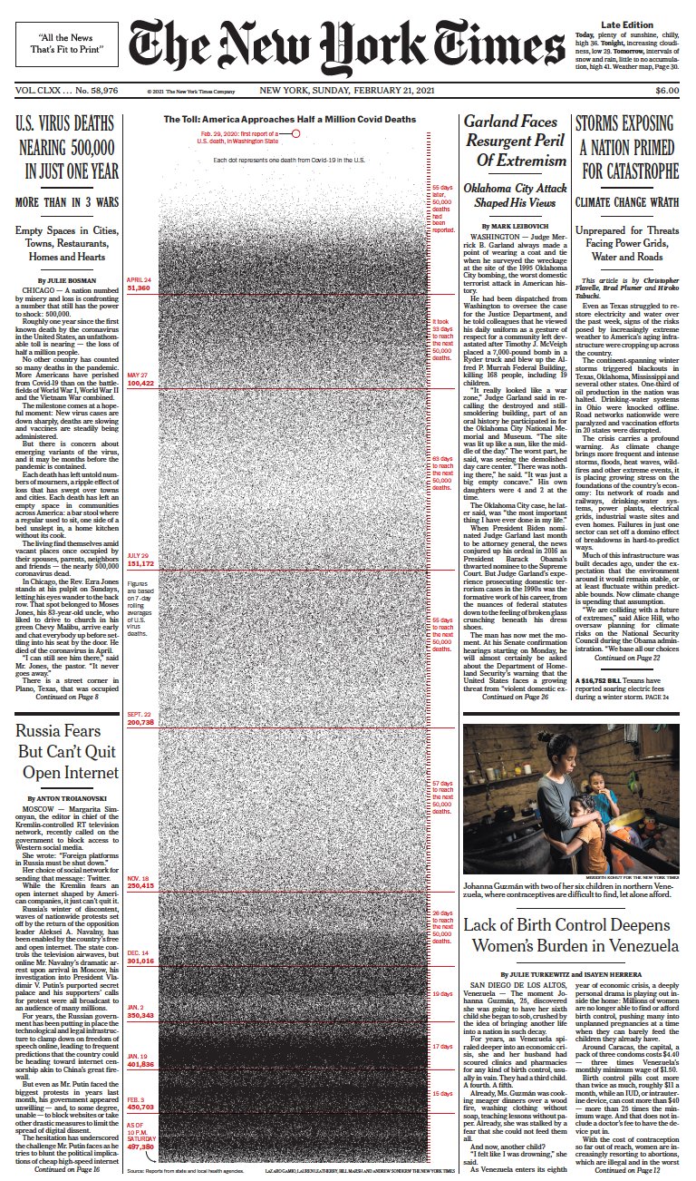 Fotografia dimineții – Prima pagină New York Times care ilustrează faptul că aproape 500.000 de americani și-au pierdut viața din cauza Covid-19: