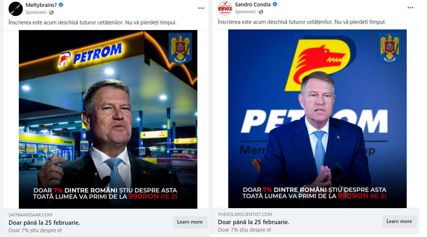 Fotografia dimineții – Profit.ro a anunțat o tentativă de fraudă online promovată prin postări sponsorizate pe Facebook, în care este utilizată și imaginea președintelui Klaus Iohannis. Hackerii pretind că, în baza unui ″decret prezidențial″ fictiv, OMV Petrom ar fi creat, sub sloganul ″Resursele naturale aparțin tuturor!″, o așa-numită ″platformă de investiții″ cu scopul de ″a oferi tuturor cetățenilor români, indiferent de vârstă, acces la resursele interne ale țării pentru asigurarea venitului stabil″, contra unei ″contribuții obligatorii unice″ de 1.225 lei: