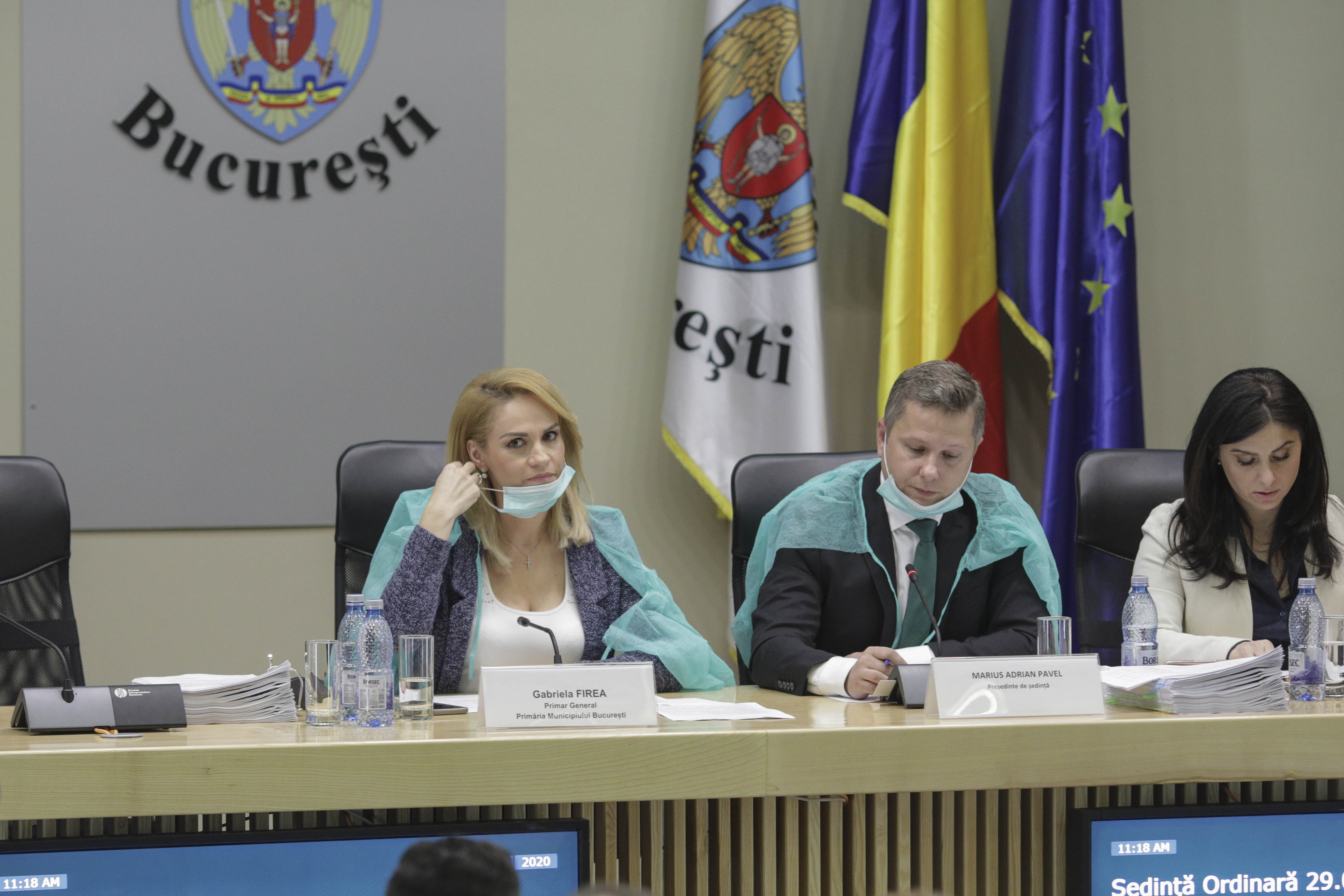 Fotografia serii – Primarul general Gabriela Firea şi consilierii generali ai PSD au venit la şedinţa Consiliului General al Municipiului Bucureşti cu halate şi măşti de protecţie pentru a se proteja de „viruşii guvernamentali”. Octav Ganea, Inquam Photos: