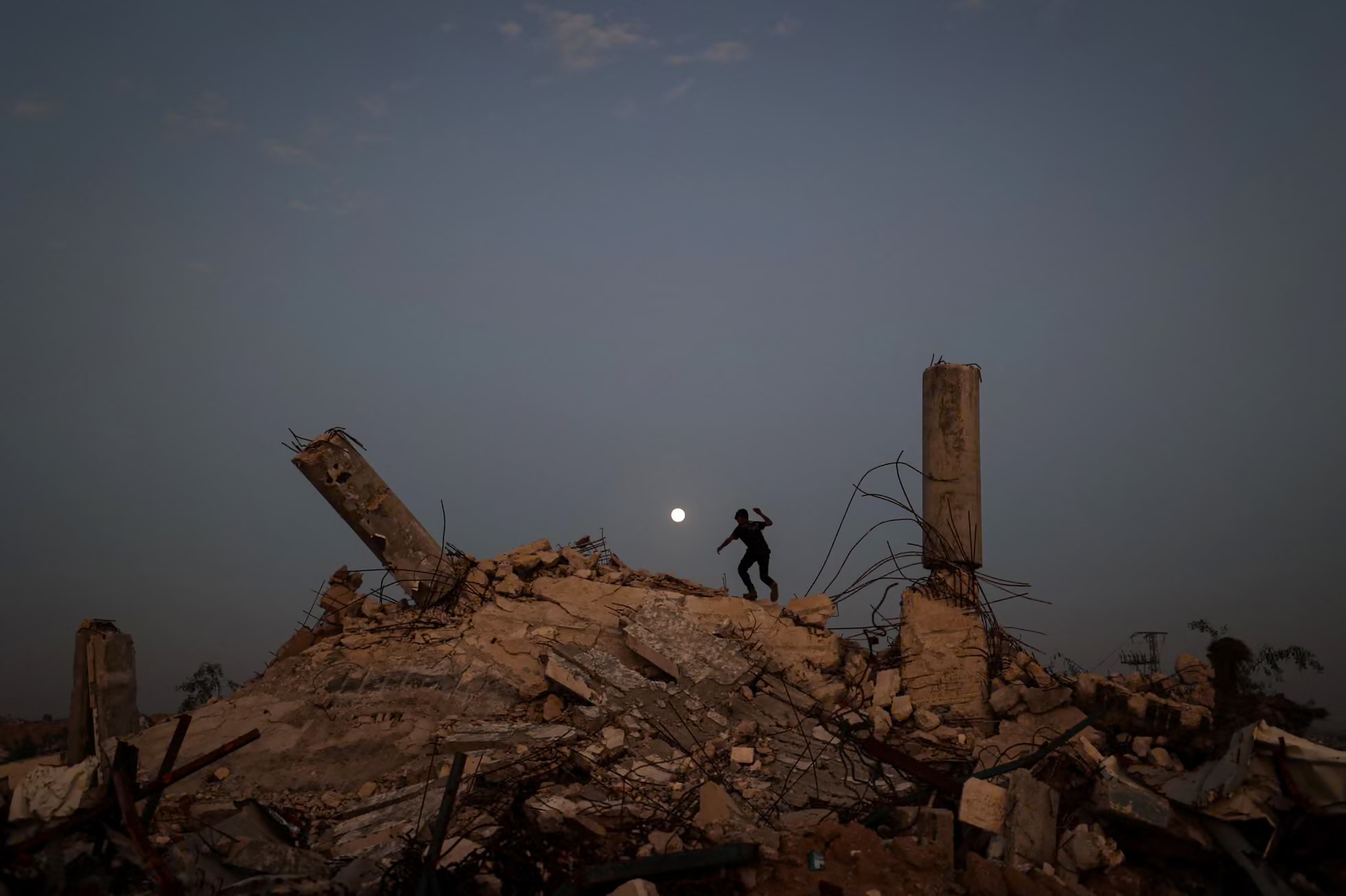 Fotografia dimineții surprinde un tânăr pe dărâmăturile unei clădiri distruse, în timp ce luna, ultima superlună a anului, se ridică deasupra taberei Nuseirat pentru palestinienii strămutați din Gaza. Eyad Baba/AFP/Getty Images: