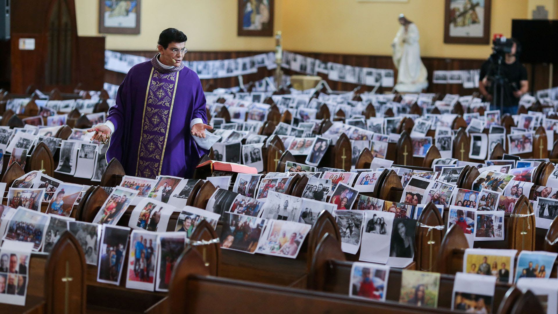 Fotografia serii – Un preot din Curitiba, Brazilia a pus fotografiile enoriașilor pe scaune pentru slujba care a fost transmisă online și pe tv. Rodolfo Buhrer/Reuters: