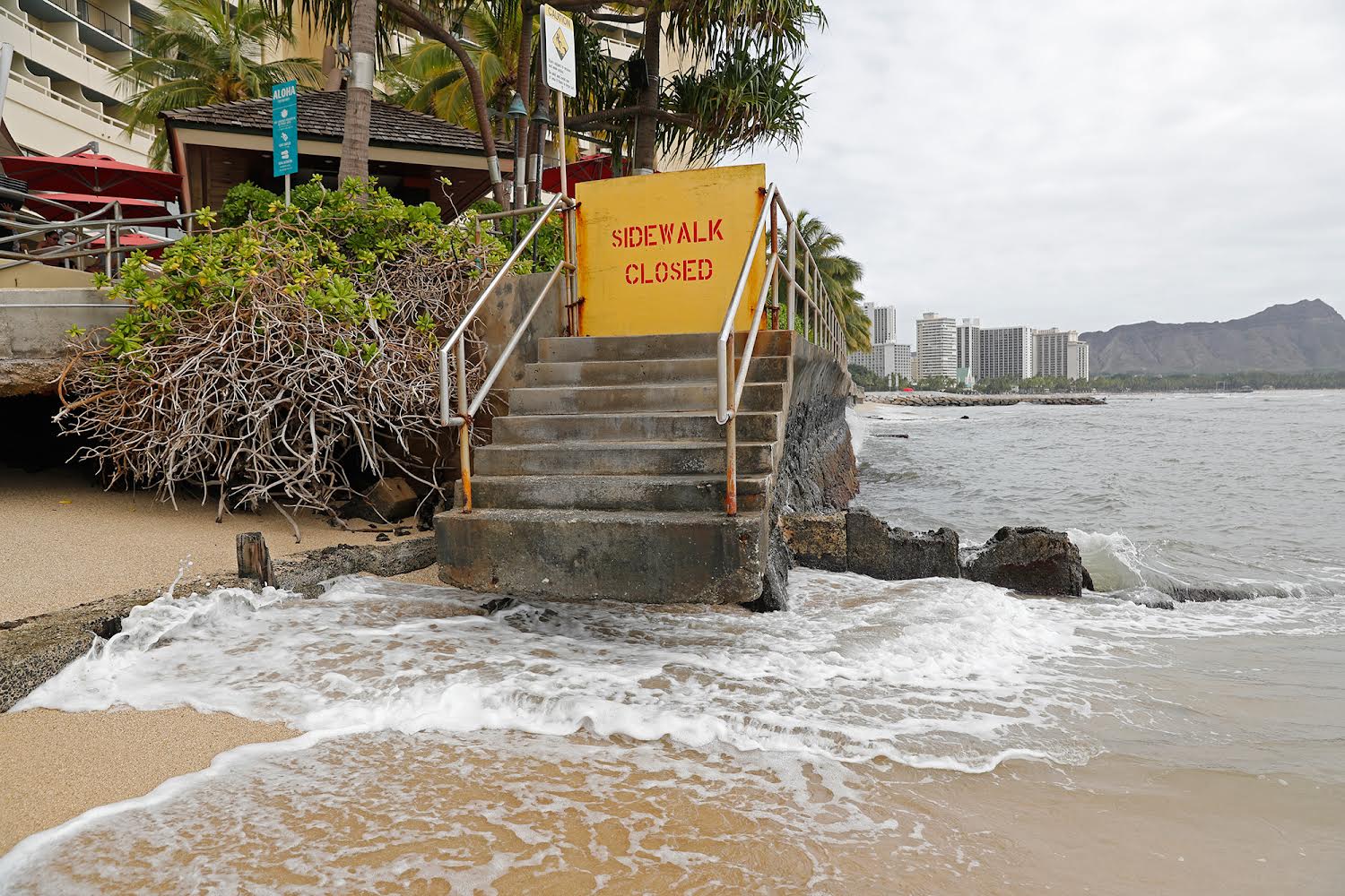 Poza ediției: Waikiki (Hawaii), 8 dec 2021. Plaja dispare. Chiar sub piscina infinită de la Sheraton Waikiki, un țărm în avans revendica o pasarelă și un set de scări de beton, care atârnă acum deasupra apei. (Politico.com)