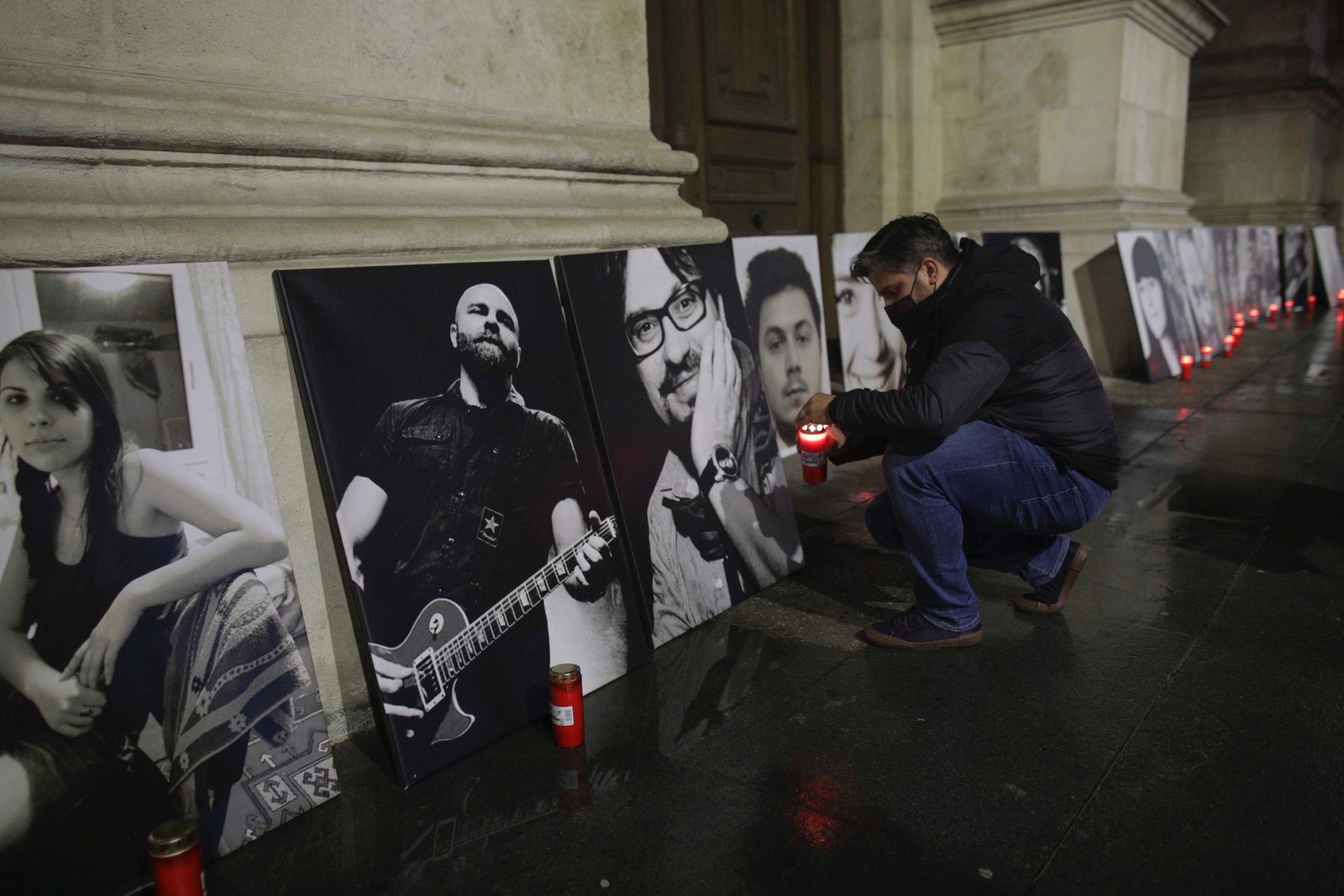 Fotografia serii – Fotografiile victimelor de la Colectiv au fost aşezate aseară pe zidurile clădirii Curții de Apel din București. Octav Ganea, Inquam Photos:
