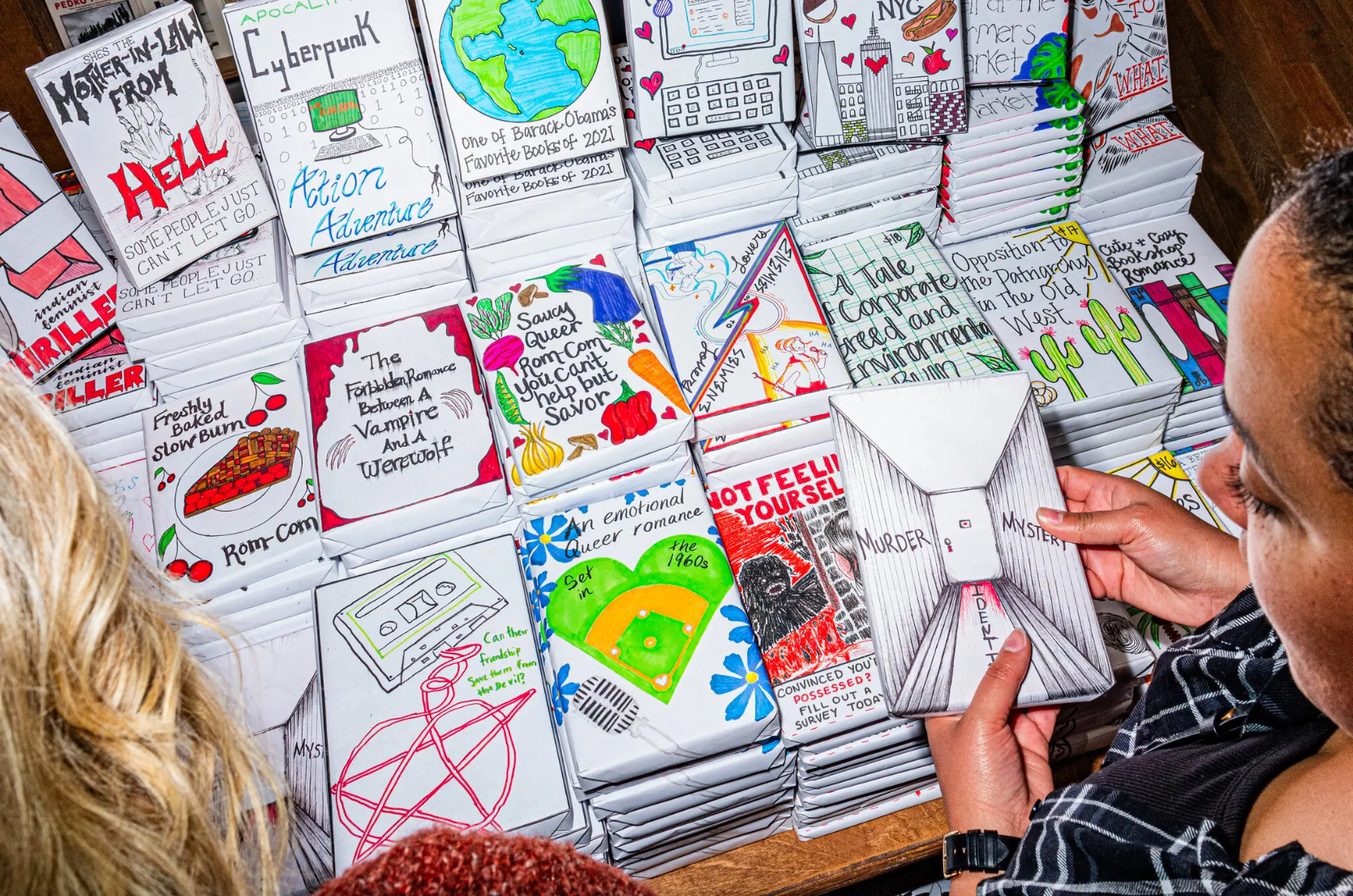 Fotografia săptămânii: Primul lucru pe care îl văd cititorii când intră în Strand, cea mai mare librărie independentă din Manhattan, este o masă cu cărți împachetate în hârtie. Cărților li se oferă descrieri vagi, scrise de mână, cum ar fi „Pentru fanii Inception” sau „Una dintre cărțile preferate din 2021 ale lui Obama” – care atrage cititorii să facă cumpărături după interesele lor, mai degrabă după autori celebri și coperta cărții. Inițiativa se intitulează „Blind Date With a Book”. Sursa: New York Times.