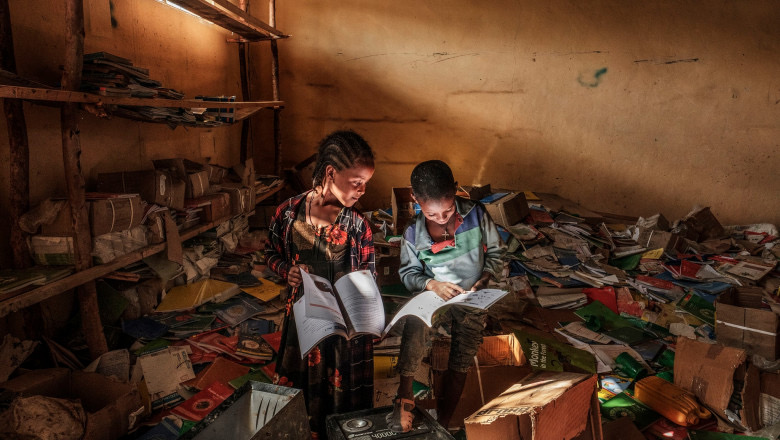 Fotografia ediției: UNICEF a desemnat o imagine care înfăţişează doi copii care citesc într-o biblioteca devastată de război din regiunea Tigray, Etiopia, drept fotografia anului 2022 (realizată de Eduardo Soteras). Sursa: Cronica dimineții.