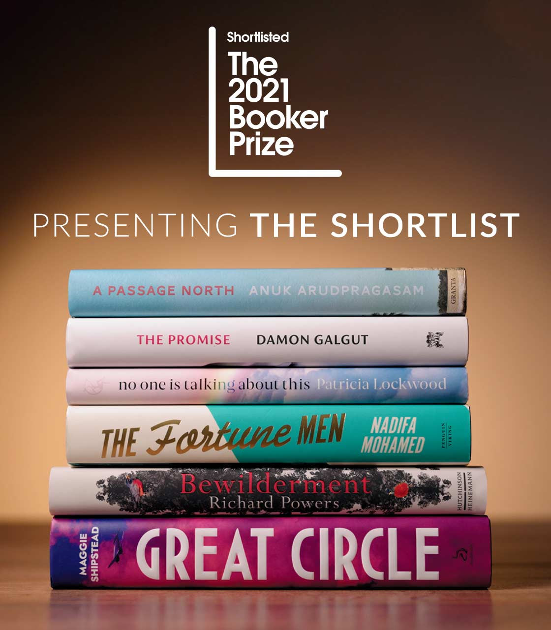 Fotografia ediției: Romanele nominalizate pe Premiul Booker 2021. Sursă: TheBookerPrizes.com.