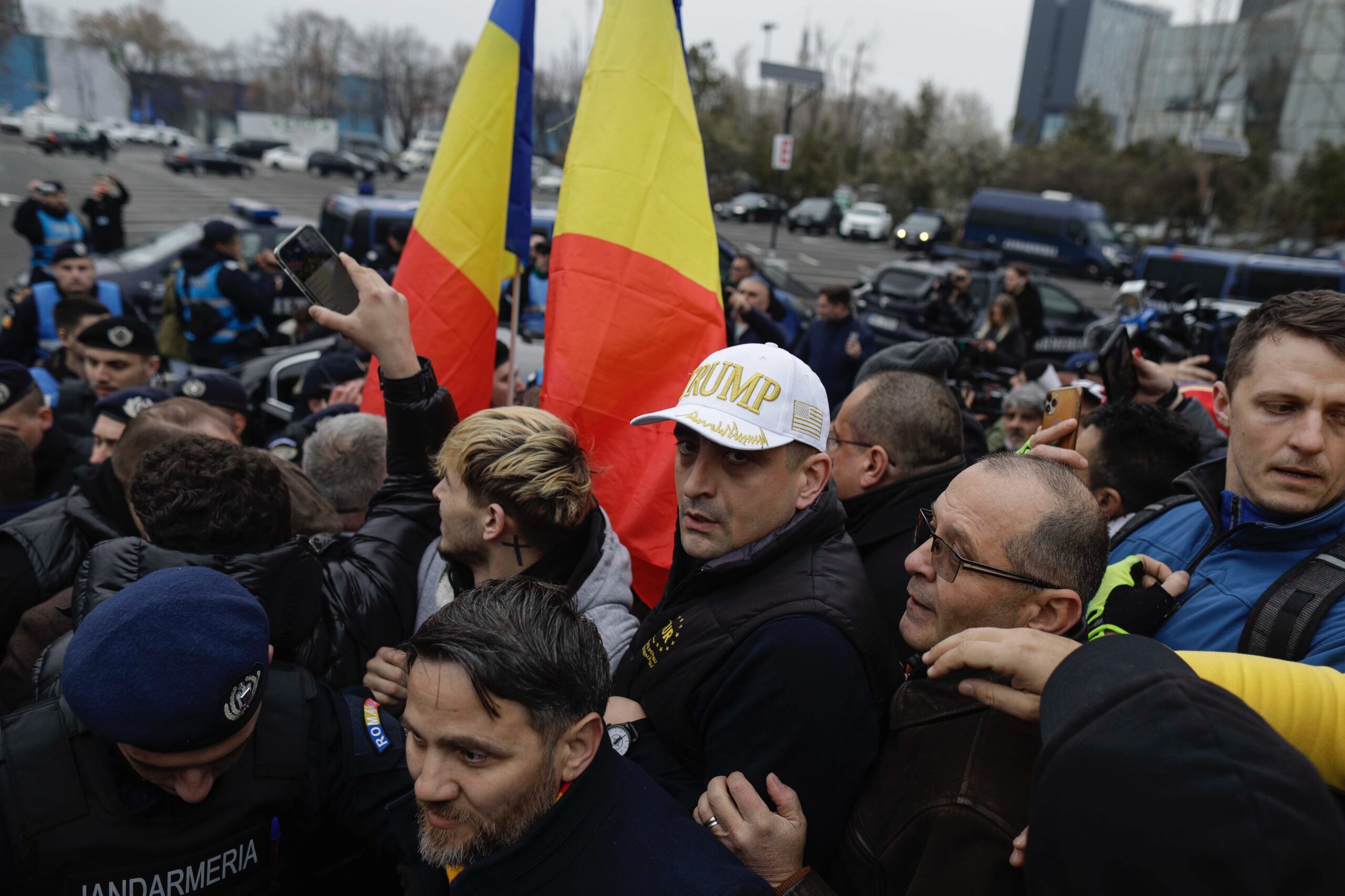 Fotografia dimineții – Liderul AUR George Simion a purtat o șapcă pe care scria “Trump” la protestul de la ROMEXPO, unde se desfășoară congresul PPE. Inquam Photos / Octav Ganea: