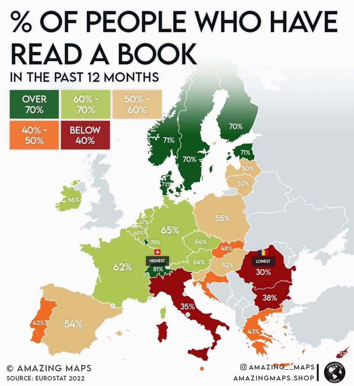 Fotografia săptămânii: Într-o statistică a numărului de persoane care au citit o carte în ultimele 12 luni, România se află pe ultimul loc în Europa, cu un procent de 30% din populație care a făcut acest lucru. Pe primul loc se află Elveția, cu un procent de 81%, urmată de Estonia și țările scandinave. Sursa: Amazing Maps/Eurostat.