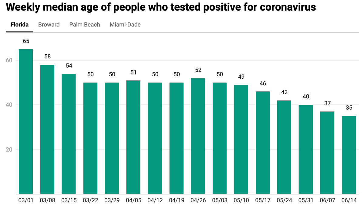 Fotografia dimineții este un grafic ce arată felul în care a evoluat vârsta medie a persoanelor infectate cu noul virus în Florida: