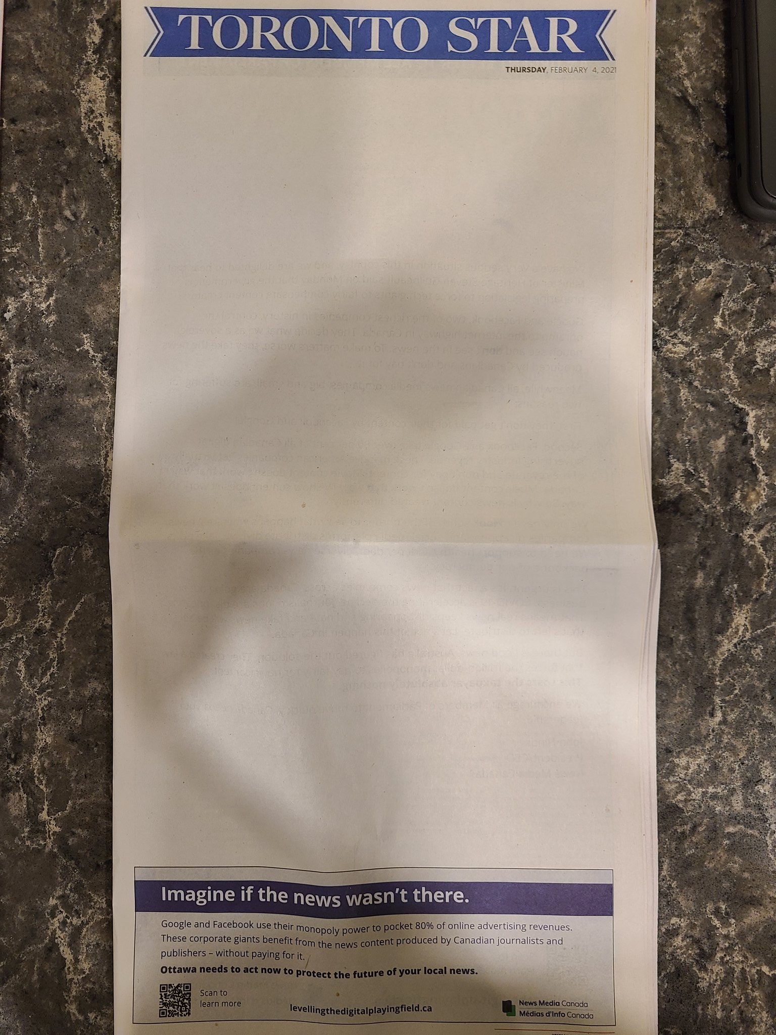 Fotografia dimineții – Cotidianul canadian Toronto Star a ieșit ieri cu prima pagină goală, pentru a protesta împotriva Google și Facebook: